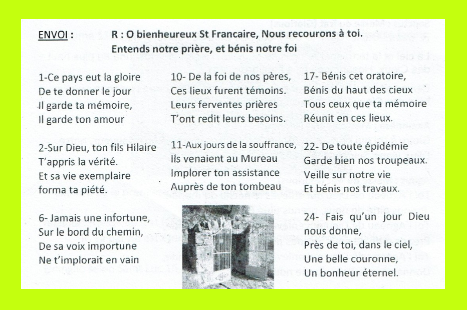 La cérémonie s’est terminée par un chant à St Francaire qui s’est transmis de génération en génération oralement. C’était sans compter sur Charlotte qui, avec le concours de Simon, a pu remettre en musique ce chant repris par toute l’assemblée.